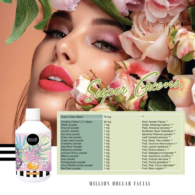 Top to Toe Tonic is a multivitamin drink with a rich formula of natural nutrients prepared specifically for women's health and wellbeing. Containing a woman’s bio active life blend and packed with vitamins, minerals and super greens it helps to boost your energy levels and immune system.